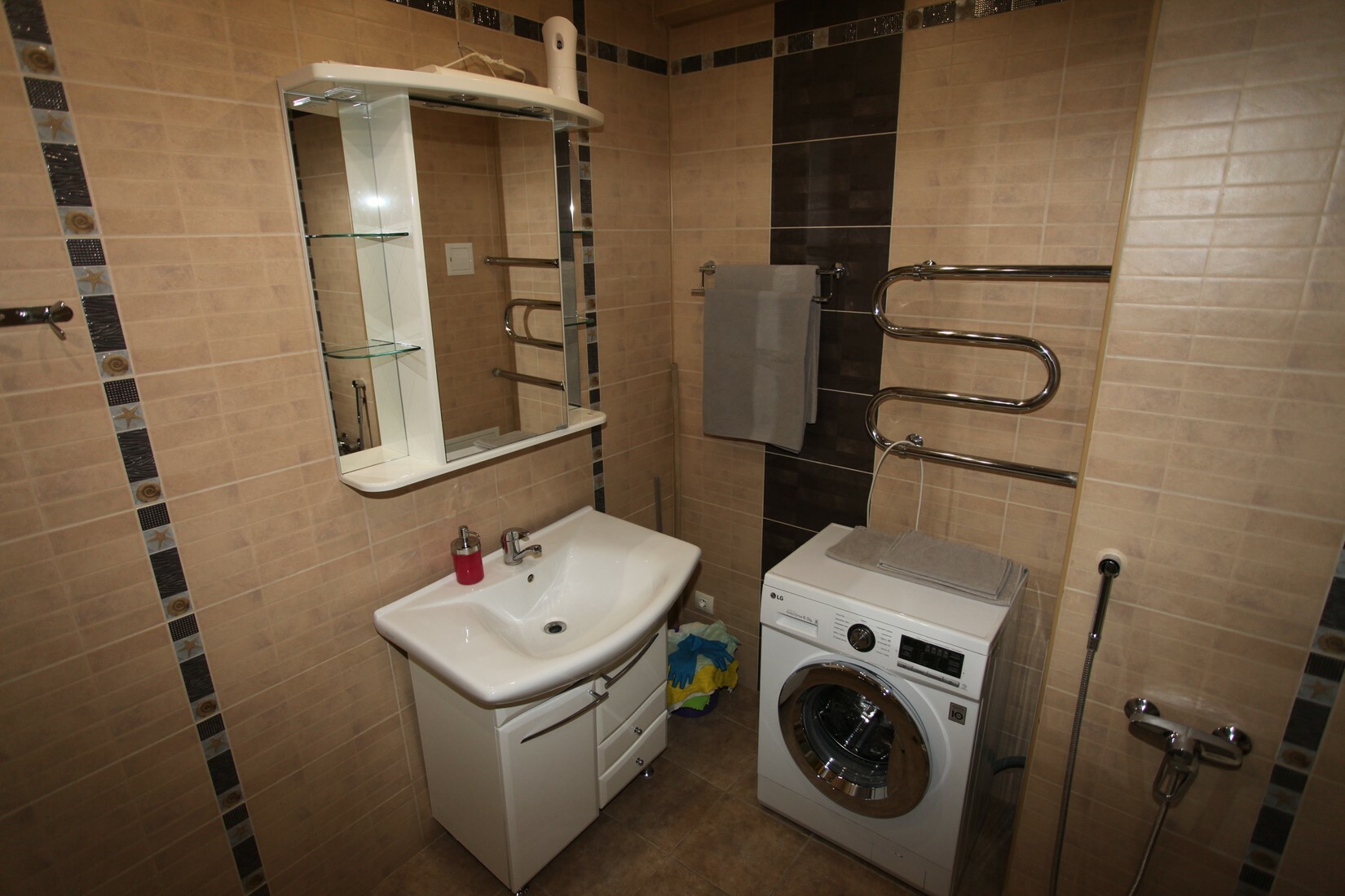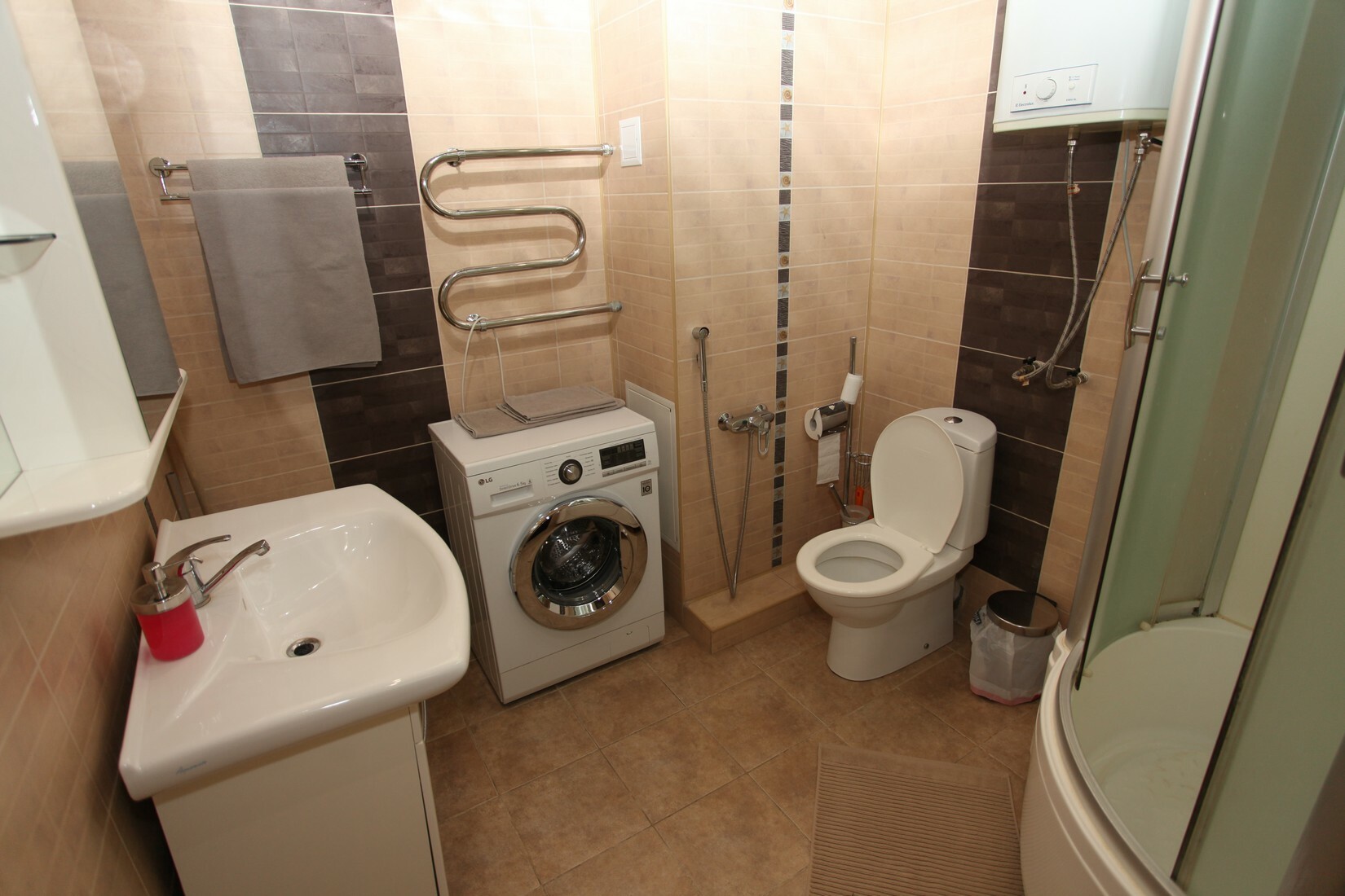 Индивидуальная ванная комната: душ, раковина, туалет, фен.