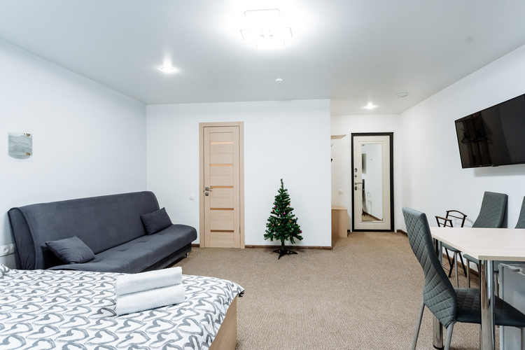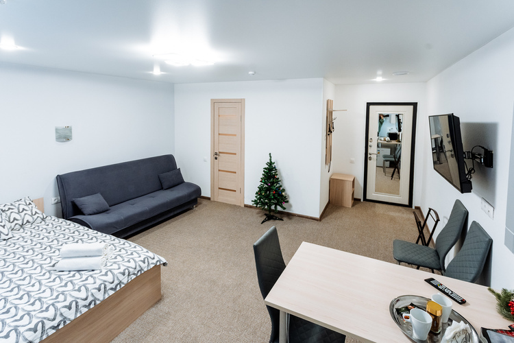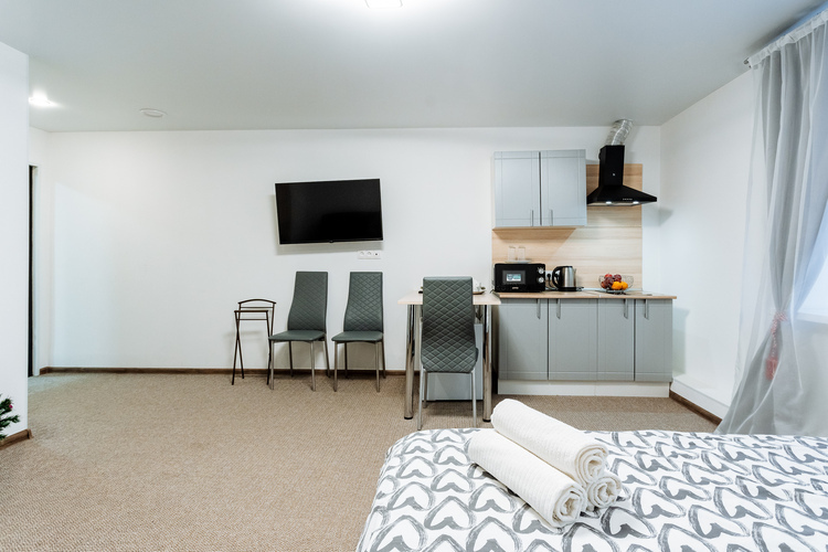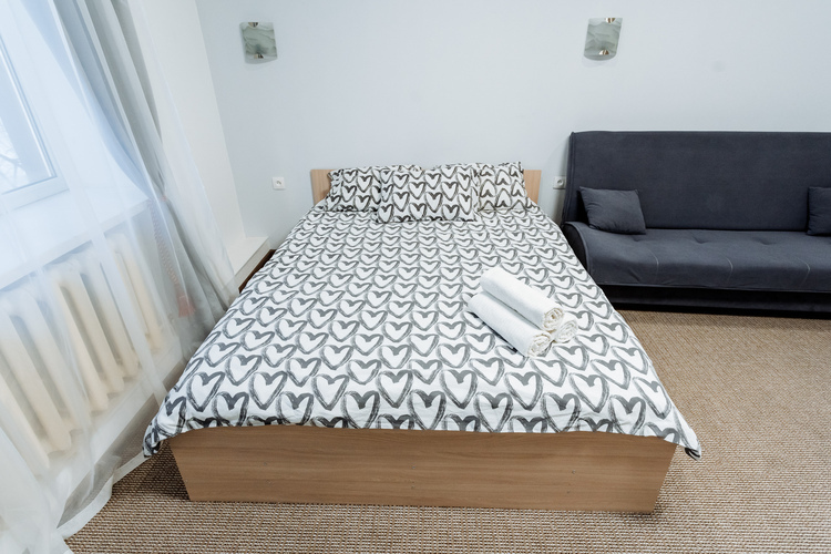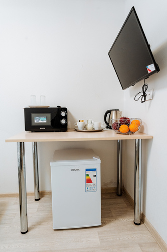 Номер с двухспальной кроватью,оформлен в светлых постельных тонах. В номере есть все удобства для комфортного проживаниЯ - телевизор, холодильник, микроволновая печь, ванная комната.
